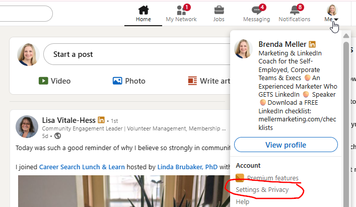 - Navigate to Settings: Starting at your LinkedIn homepage. Click on your **Me** icon (the one with your profile photo) in the top menu bar.