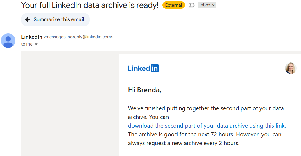 - Download the Files: Once your data is ready, you will receive an email from LinkedIn with the subject line "**Your full LinkedIn data archive is ready**". Follow the link in the email back to LinkedIn and click **Download data**.