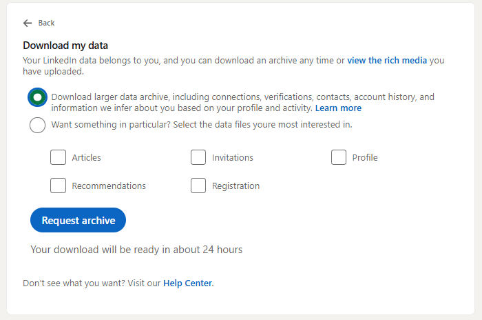 - Download larger data archive: This includes your connections, account history, and more. This is the option I recommended. It will take about 24 to 48 hours to be ready, and LinkedIn will email you in two batches.